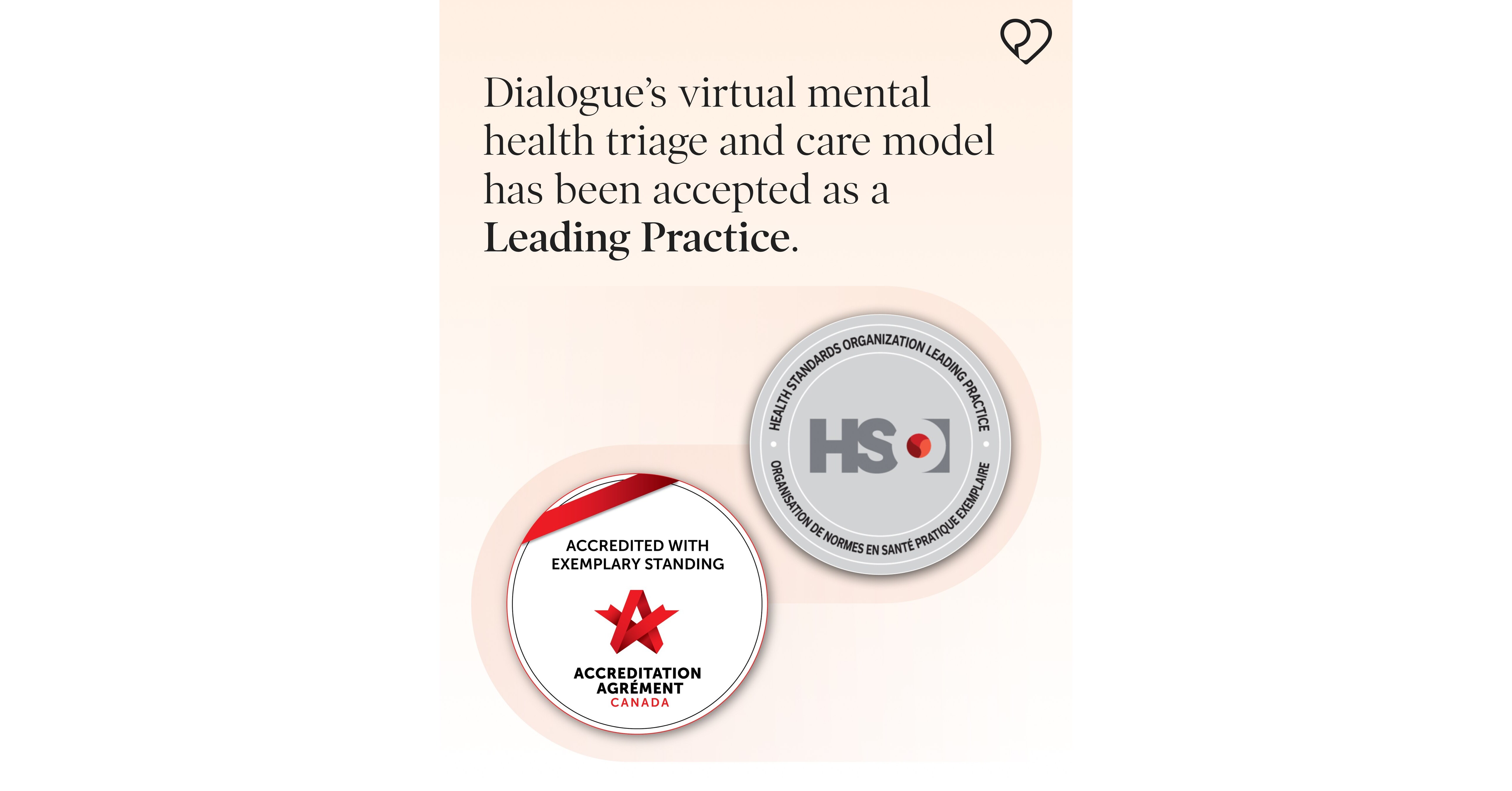 MONTREAL, Nov. 6, 2025 /CNW/ – Dialogue Health Technologies Inc. (“Dialogue”)’s virtual mental health triage and care model has received the Leading Practice certificate from Health Standards Organization (HSO) and its affiliate, Accreditation Canada. HSO is the only Standards Development Organization solely dedicated to health and social services, developing standards, assessment programs, and tools that promote quality and safety in care. This distinction celebrates people-centred, evidence-informed innovations that improve access, quality, and the overall care experience.